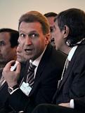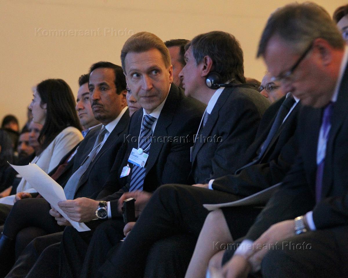 Первый заместитель председателя правительства России Игорь Шувалов (в центре), заместитель председателя правительства России Игорь Сечин (второй справа) и президент "Внешторгбанка" Андрей Костин (справа) на Всемирном экономическом форуме в Давосе.