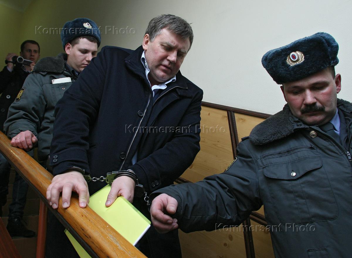 Владелец холдинга "Энергомаш" Александр Степанов (слева), задержанный по делу о мошенничестве, после заседания Тверского суда.