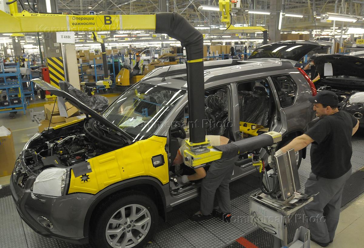 Рабочие во время работы на конвейере в цехе сборки автомобильного завода "Ниссан Мэнуфэкчуринг Рус" (Nissan).