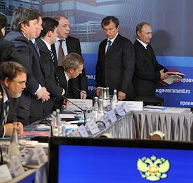 Полномочный представитель президента России в Северо-Западном федеральном округе Илья Клебанов (третий справа), председатель правительства России Владимир Путин (второй справа) и заместитель председателя правительства России Игорь Сечин (справа) на совещании по вопросу "Об итогах деятельности топливно-энергетического комплекса в 2010 году и задачах на 2011 год".