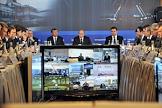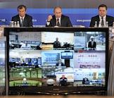 Председатель правительства России Владимир Путин (слева) и президент Республики Татарстан Рустам Минниханов (справа) на совещании в формате видеоконференции по подготовке ХХVII Всемирной летней универсиады.