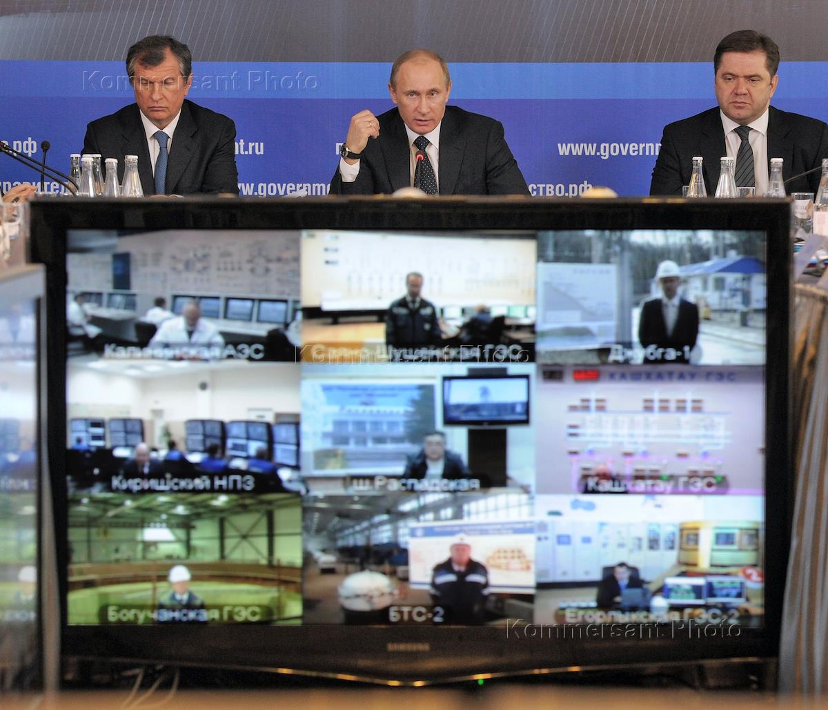 В центра слева направо: заместитель председателя правительства России Игорь Сечин, председатель правительства России Владимир Путин и министр энергетики России Сергей Шматко на совещании по вопросу "Об итогах деятельности топливно-энергетического комплекса в 2010 году и задачах на 2011 год".
