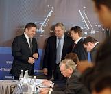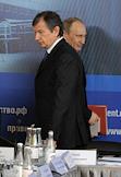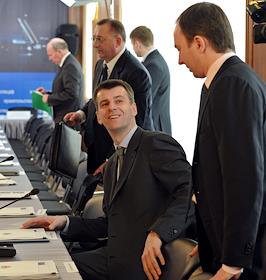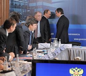 Генеральный директор ОАО "СУЭК" Владимир Рашевский (третий справа) и президент "Онэксим" Михаил Прохоров (второй справа) на совещании по вопросу "Об итогах деятельности топливно-энергетического комплекса в 2010 году и задачах на 2011 год".