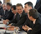 Полномочный представитель президента России в Северо-Западном федеральном округе Илья Клебанов (третий справа), заместитель председателя правительства России Игорь Сечин (второй справа) и председатель правительства России Владимир Путин (справа) на совещании по вопросу "Об итогах деятельности топливно-энергетического комплекса в 2010 году и задачах на 2011 год".