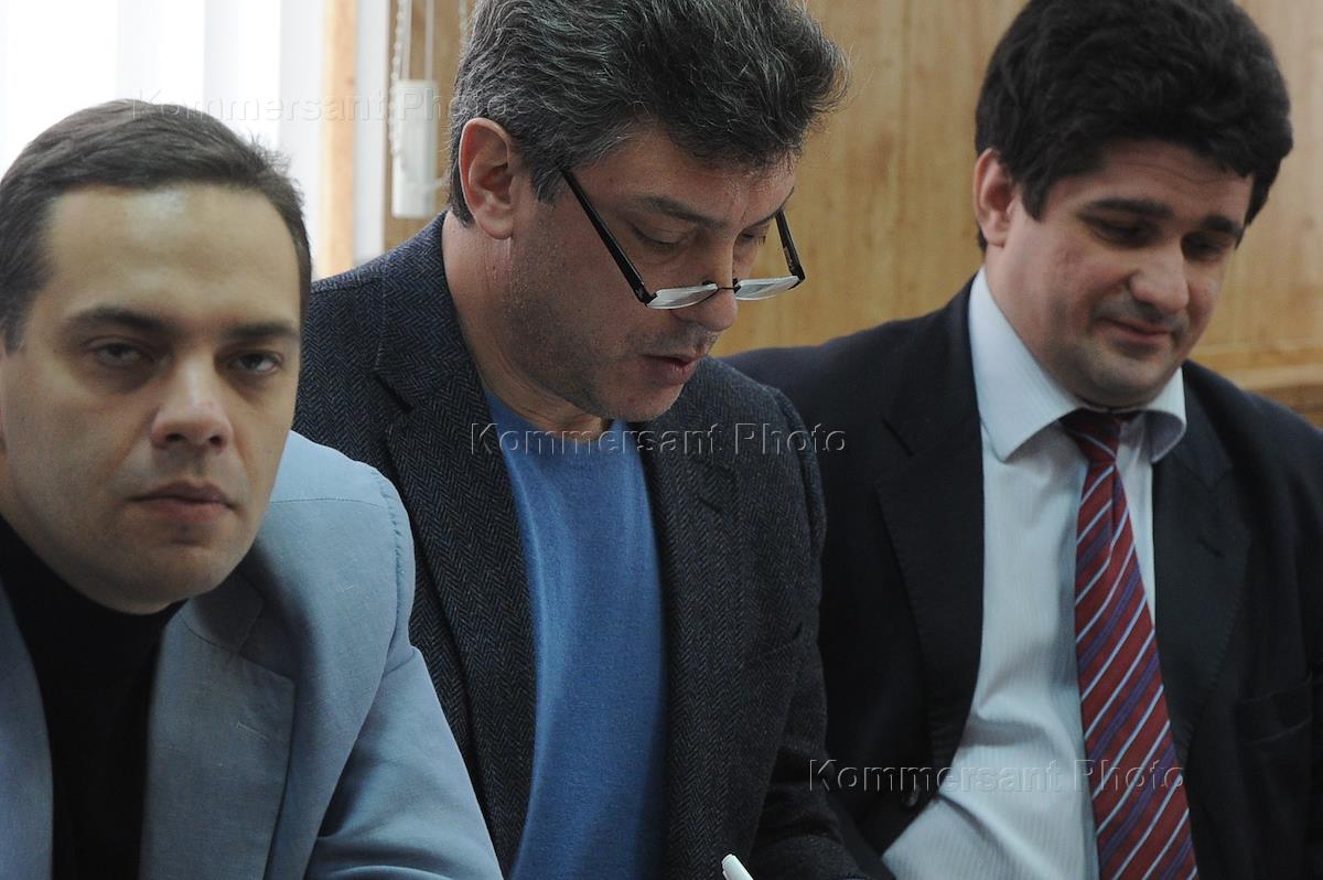 Слева направо: лидер движения "Демократический выбор" Владимир Милов, сопредседатель оппозиционного движения "Солидарность" Борис Немцов и адвокат Вадим Прохоров на рассмотрении иска оппозиционных политиков Бориса Немцова, Владимира Милова и Владимира Рыжкова о защите чести и достоинства. Заседание прошло в Савеловском районном суде.