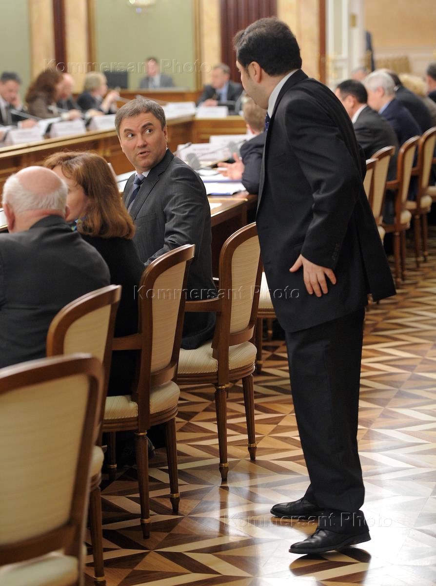 Заместитель председателя правительства России - руководитель аппарата правительства Вячеслав Володин (в центре) и ректор Российской академии народного хозяйства и госслужбы Владимир Мау (справа) перед началом встречи председателя правительства России Владимира Путина с руководителями экспертных групп по подготовке предложений по актуальным проблемам стратегии социально-экономического развития России на период до 2020 года. Встреча прошла в Доме правительства России.