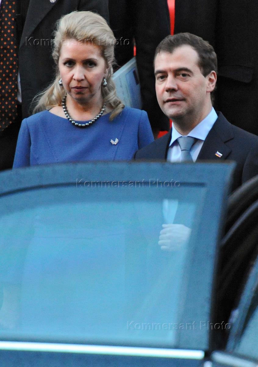 Супруга президента России Светлана Медведева (слева) и президент России Дмитрий Медведев (справа) во время церемонии открытия "Года культуры России и Италии" во Дворце экспозиции в Риме.