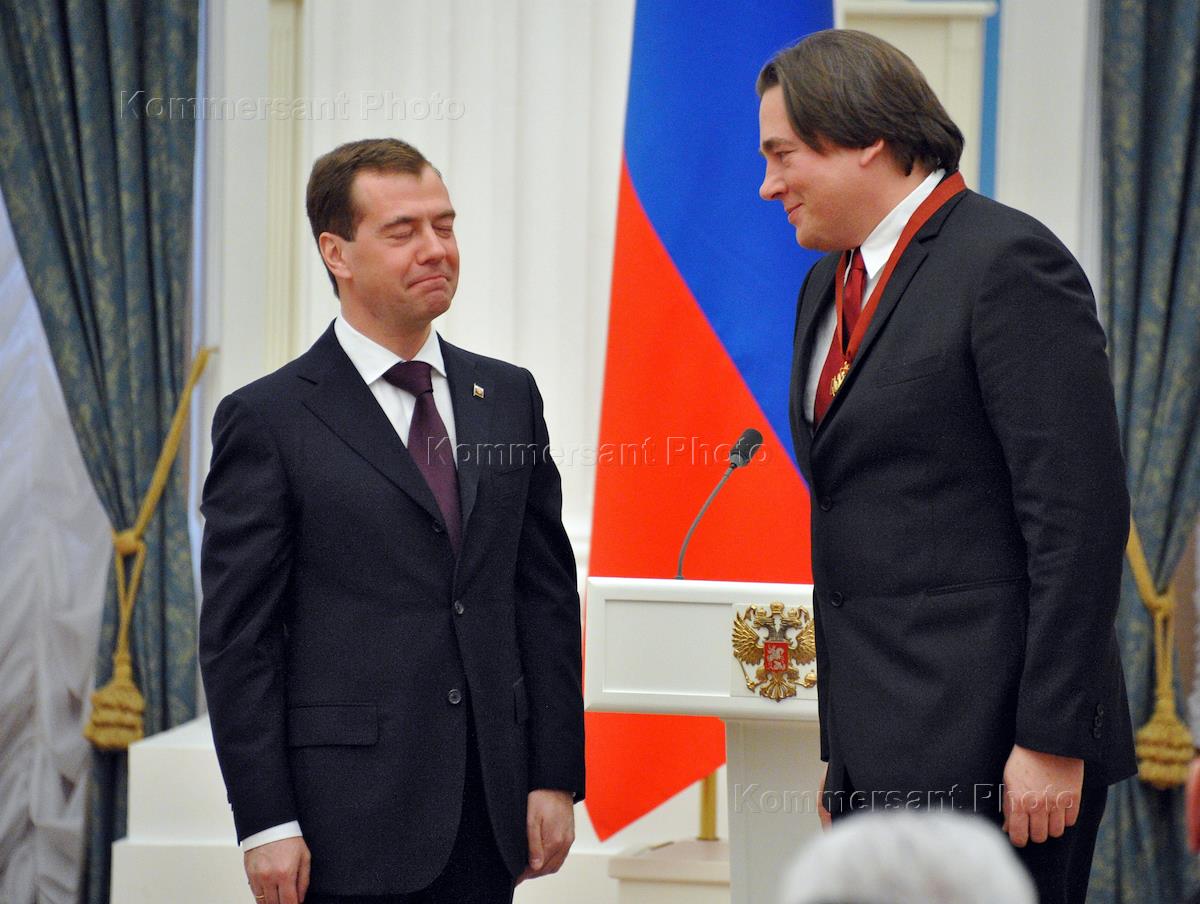 Президент России Дмитрий Медведев (слева) и генеральный директор телекомпании "Первый канал" Константин Эрнст (справа) на церемонии вручения Государственных наград в Кремле. Константину Эрнсту был вручен орден "За заслуги перед Отечеством" 3-ей степени.