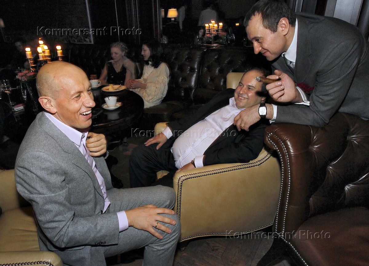 Слева направо: президент ЗАО "Скарлетт" Дмитрий Меркулов, совладелец холдинга "Адамант", совладелец ювелирного дома Gold Union Евгений Гуревич и директор ГУ "Музей ретро-автомобилей" Дмитрий Октябрьский на презентации новой коллекции ювелирного дома Gavello в ресторане "Большой".