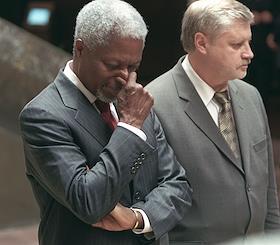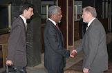 Генеральный секретарь ООН Кофи Аннан (в центре) и председатель Совета Федерации Сергей Миронов (справа) во время встречи в Совете Федерации. Генеральный секретарь ООН Кофи Аннан посетил Москву в рамках поездки по ряду стран Европы.