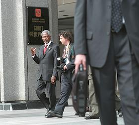 Генеральный секретарь ООН Кофи Аннан (слева) после встречи в Совете Федерации. Кофи Аннан посетил Москву в рамках поездки по ряду стран Европы.