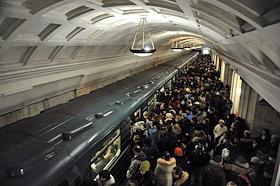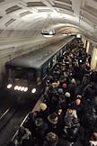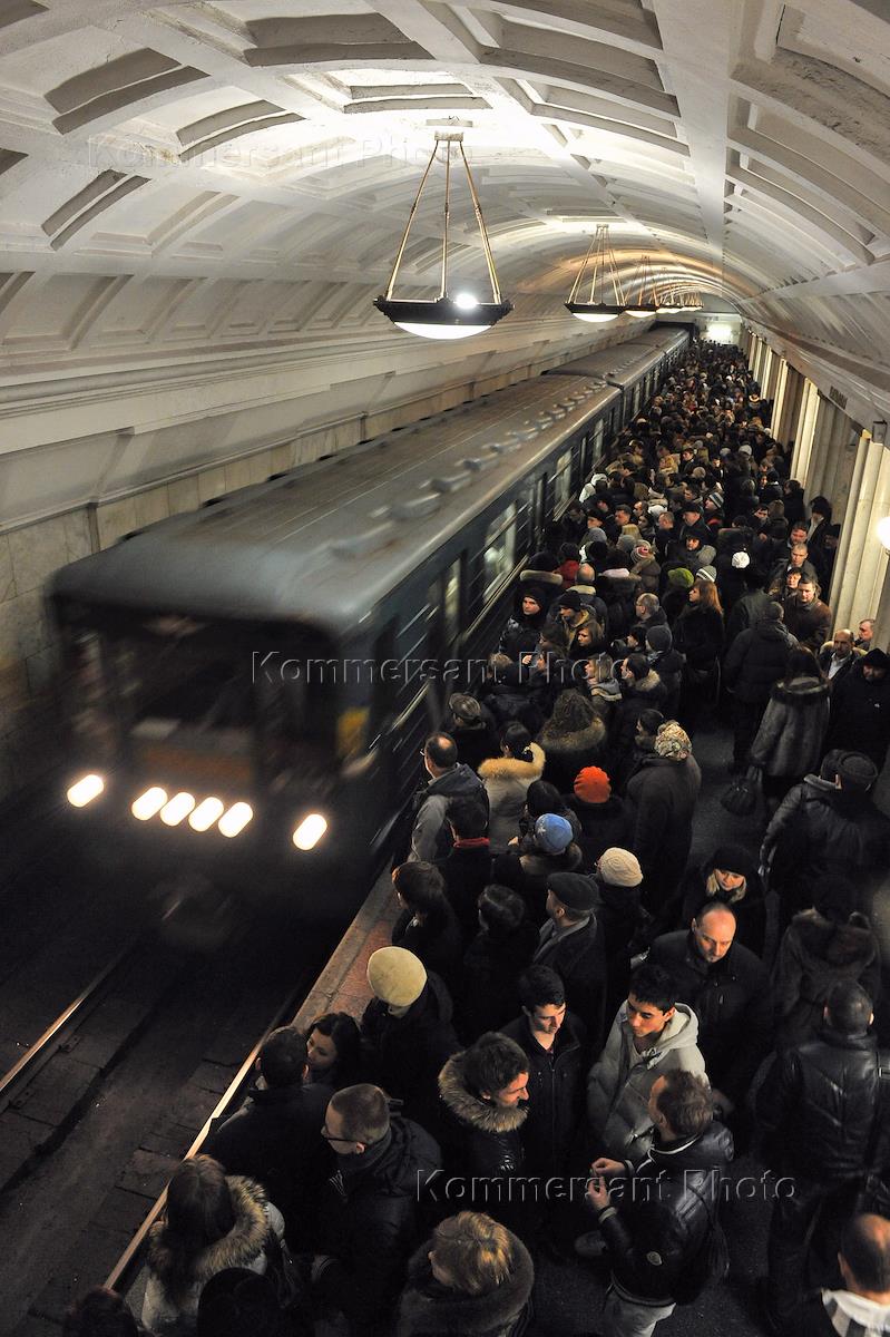 Жанровая фотография. Московский метрополитен. Пассажиры на платформе станции метро "Театральная" в час пик.