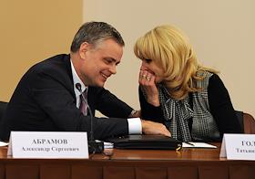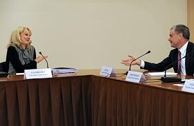 Помощник президент России Александр Абрамов (слева) и министр здравоохранения и социального развития России Татьяна Голикова (справа) на совещании по вопросам государственной политики в сфере занятости населения.