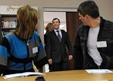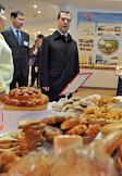 Президент России Дмитрий Медведев (справа) во время посещения выставки товаров, производимых предпринимателями, получившими субсидию по программе содействия развитию малого предпринимательства и самозанятости.