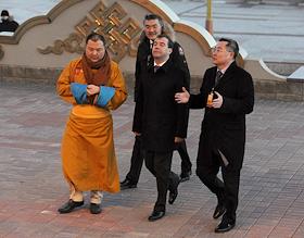 Президент России Дмитрий Медведев (справа в центре) и президент республики Калмыкия Алексей Орлов (в центре слева) во время посещения главного буддийского храма (хурул) Калмыкии "Золотая обитель Будды Шакьямуни".