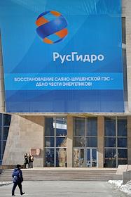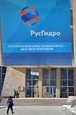 Саяно-Шушенская гидроэлектростанция (ГЭС) имени П.С. Непорожного. Главный вход ГЭС. Плакат с надписью "РусГидро. Восстановление Саяно-Шушенской ГЭС - дело чести энергетиков!".