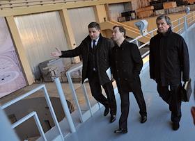 Слева направо: председатель правления ОАО "Русгидро" Евгений Дод, президент России Дмитрий Медведев и заместитель председателя правительства России Игорь Сечин во время посещения Саяно-Шушенской гидроэлектростанции имени П.С. Непорожного.