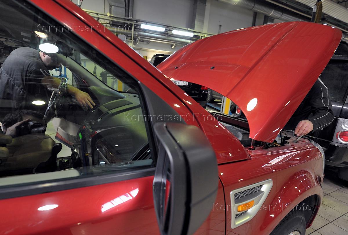 Автосалон "Независимость". Рабочие салона проводят осмотр автомобиля Рендж Ровер (Range Rover).