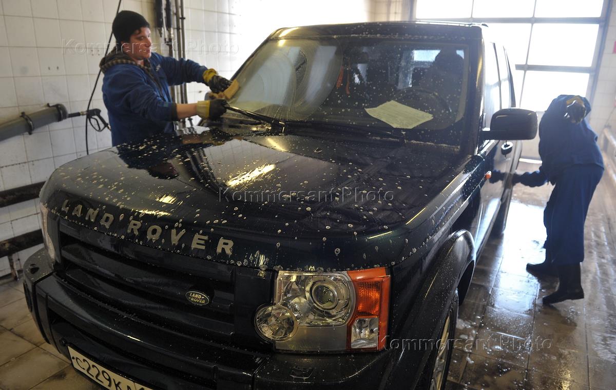 Автосалон "Независимость". Рабочие салона моют автомобиль "Лэнд Ровер" (Land Rover).