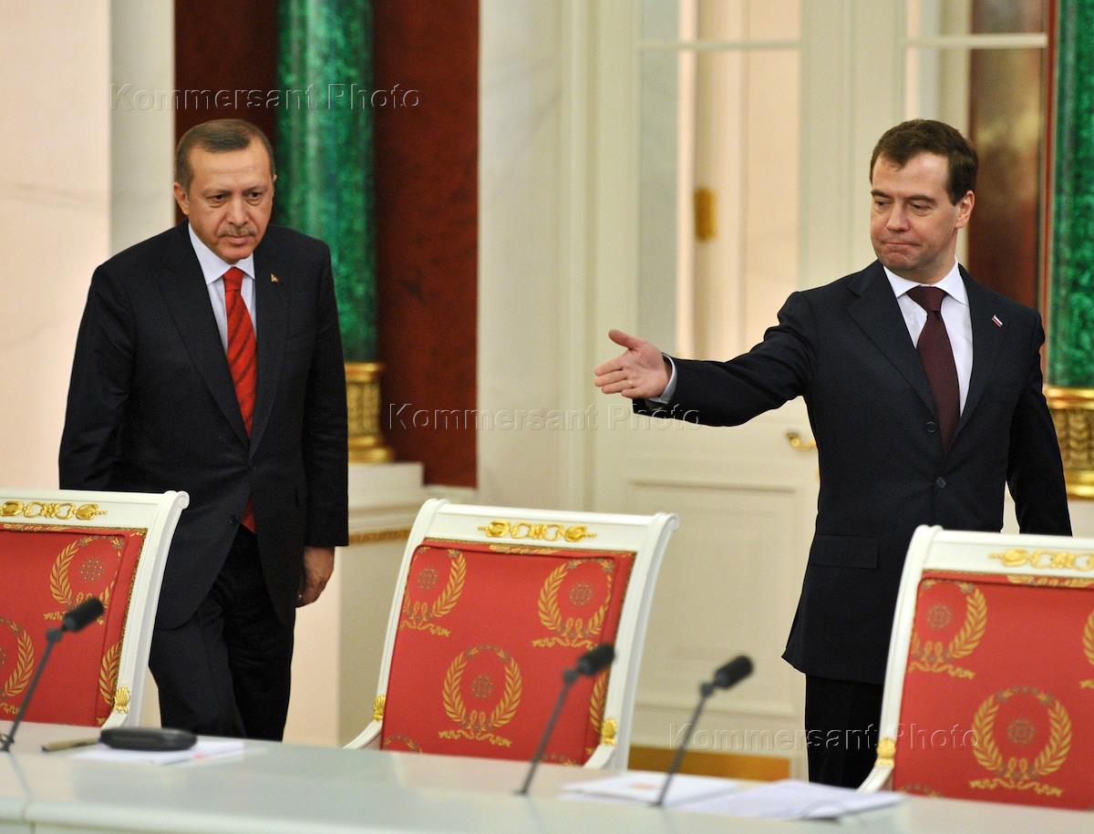 Премьер-министр Турции Реджеп Тайип Эрдоган (слева) и президент России Дмитрий Медведев (справа) на церемонии подписания документов по итогам переговоров в Кремле.