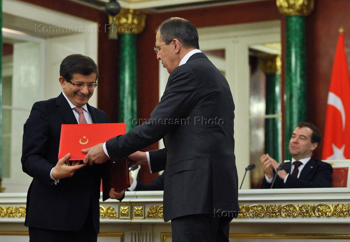 Слева направо: министр иностранных дел Турции Ахмет Давутоглу, министр иностранных дел России Сергей Лавров и президент России Дмитрий Медведев на церемонии подписания документов по итогам переговоров в Кремле.