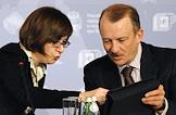 Главный экономист Сберегательного банка России Ксения Юдаева (слева) и директор по макроэкономическим исследованиям НИУ "Высшая школа экономики" Сергей Алексашенко (справа) во время Международной научно-практической конференции "Россия и мир: в поисках инновационной стратегии" в рамках Гайдаровского Форума 2011.