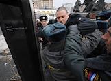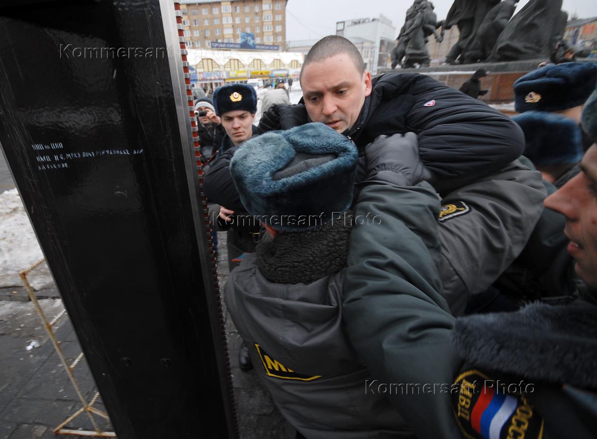 Лидер оппозиционного движения "Левый фронт" Сергей Удальцов (в центре) во время проведения акции протеста против повышения цен на топливо. Митинг, организованный Федерацией автовладельцев России, прошел на площади Краснопресненской заставы у станции метро "Улица 1905 года".