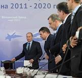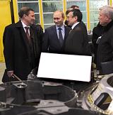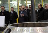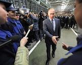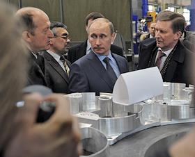 General Director of the Votkinsk factory Nikolay Tolmachev (second right), Deputy Prime Minister of Russia Sergey Ivanov (left), President of Umudtia Alexander Volkov (third right), Russian Prime Minister Vladimir Putin (centre), chief technologist of the Votkinsk factory Alexander Chirkov (third right) and Head of Russian Federal Space Agency Anatoly Perminov (right) during a visit to the Votkinsk factory.