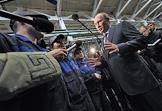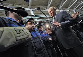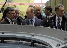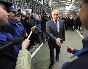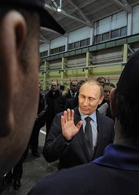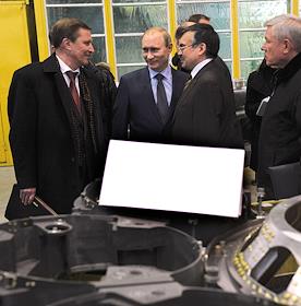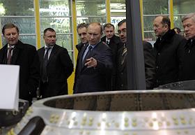 General Director of the Votkinsk factory Nikolay Tolmachev (third right), Russian Prime Minister Vladimir Putin (centre), chief technologist of the Votkinsk factory Alexander Chirkov (left), Head of Russian Federal Space Agency Anatoly Perminov (second left) and the President of Udmurtia Alexander Volkov (right) during a visit to the Votkinsk factory.
