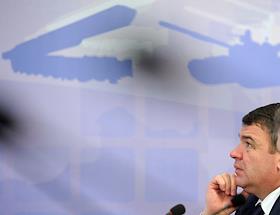 Prime Minister Vladimir Putin (left) and Minister of Defence Anatoly Serdyukov (second left) during a meeting regarding the implementation of the state Weapon Programme for 2011-2020.
