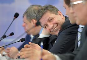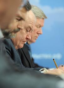 Left to right: Deputy Minister of Economic Development of Russia Andrei Klepach, chief of staff of the Military-Industrial Commission under the Russian government - Deputy Chief of Staff of the Russian Government Igor Borovkov and the head of the Russian Federal Space Agency Anatoly Perminov during the meeting on the implementation of the state armament program for 2011-2020. The meeting took place at the office building of the Votkinsk factory JSC.