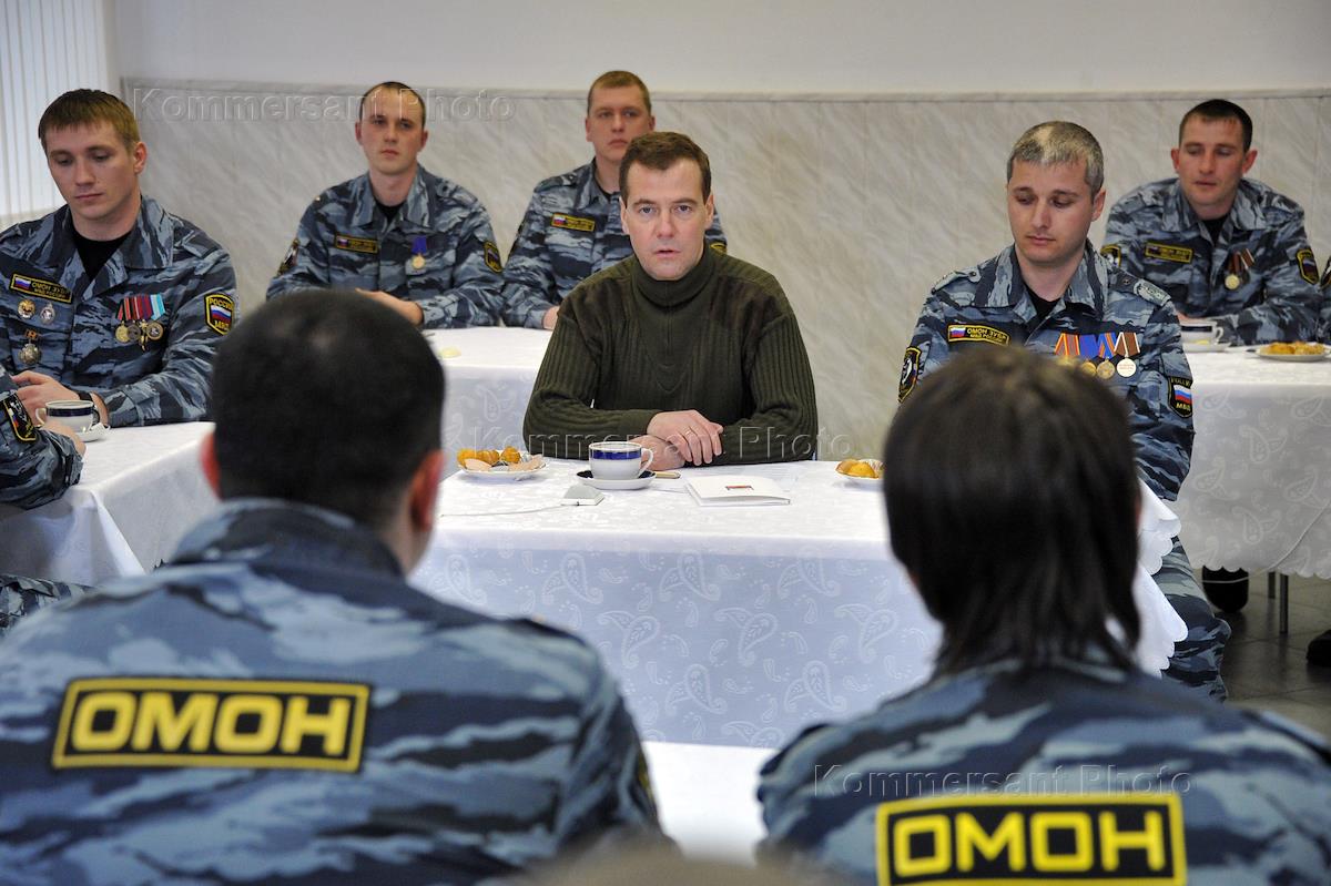 Президент России Дмитрий Медведев (в центре) во время посещения базы ОМОН "Зубр" в Щелково.