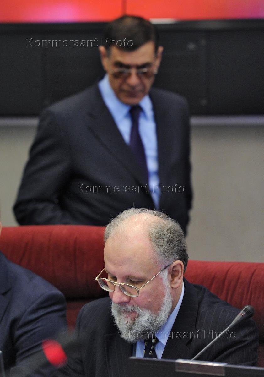 Председатель Центральной избирательной комиссии (ЦИК) России Владимир Чуров (слева) и член ЦИК России Борис Эбзеев (справа) на первом заседании нового состава ЦИК России.