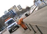 Дорожный рабочий чистит ограничительные столбы на разделительной полосе Сколковского шоссе.