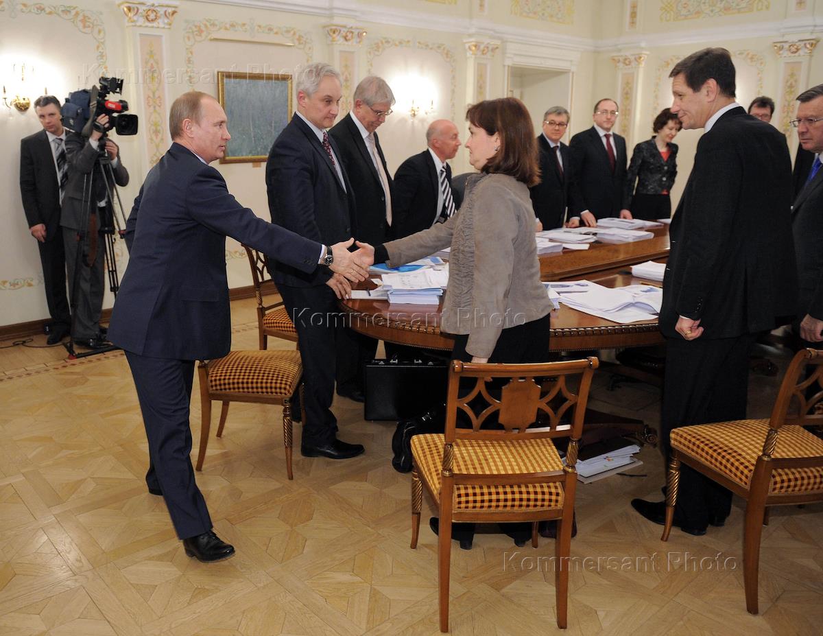 Слева направо: председатель правительства России Владимир Путин, директор департамента экономики и финансов аппарата правительства России Андрей Белоусов, председатель Центрального Банка России Сергей Игнатьев, Ректор Всероссийской академии внешней торговли Министерства экономического развития России Сергей Синельников-Мурылев, министр экономического развития России Эльвира Набиуллина и заместитель председателя правительства России, президент Олимпийского комитета России Александр Жуков (справа) во время совещания по вопросу "О предварительных результатах экспертной работы по актуальным проблемам социально-экономической стратегии России на период до 2020 года". Совещание прошло в Ново-Огарево.