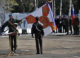 Президент РФ Дмитрий Медведев во время посещения расположения 45-го отдельного гвардейского ордена Александра Невского полка специального назначения Воздушно-десантных войск в подмосковной Кубинке. Президент наградил полк спецназа ВДВ орденом Кутузова, прикрепив награду и орденскую ленту к Георгиевскому знамени подразделения.