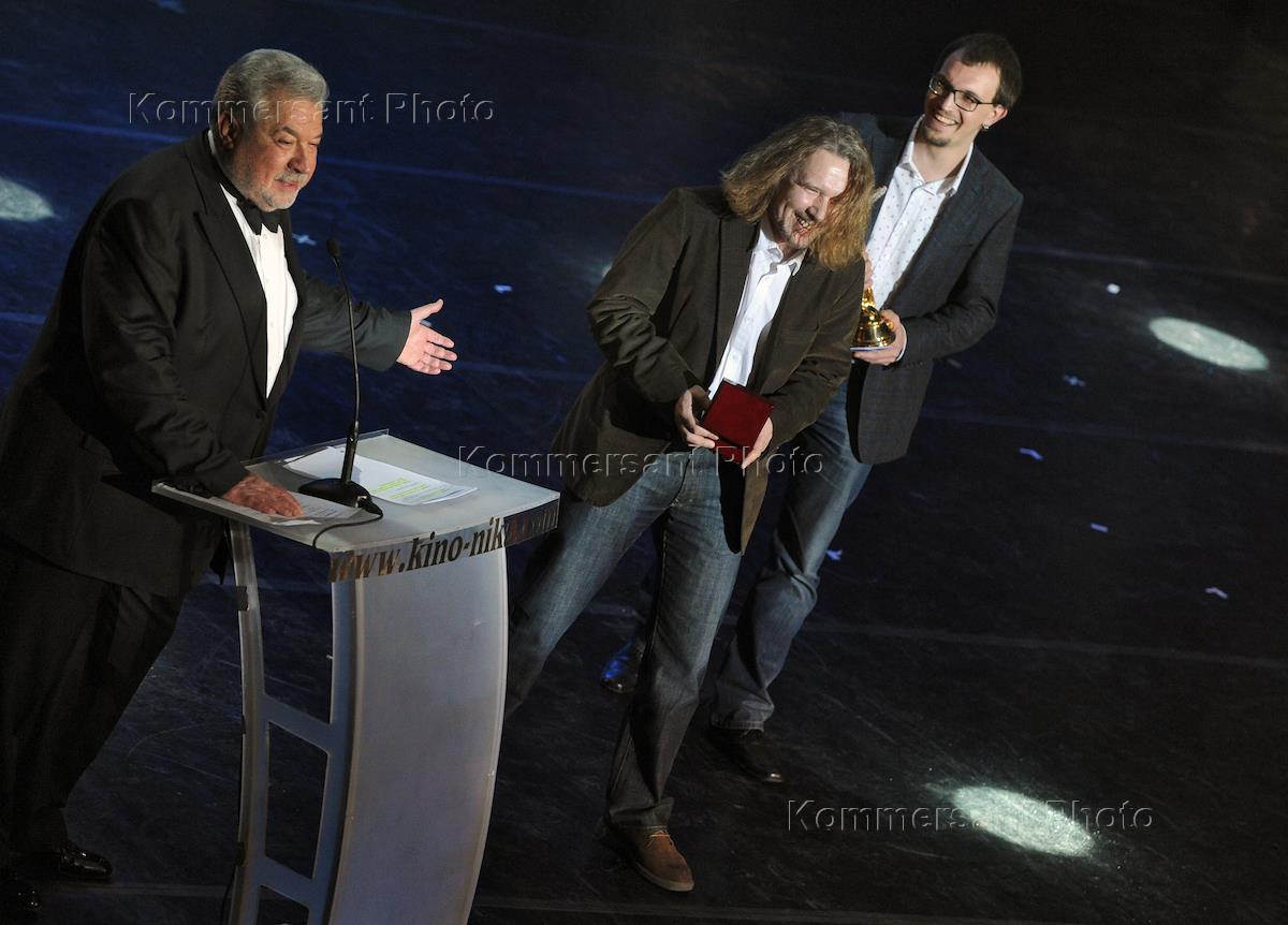 Режиссер Алексей Учитель (в центре) и генеральный директор телекомпании "Первый канал" Константин Эрнст (справа) на XXIV церемонии вручения национальной кинематографической премии "Ника". Церемония прошла в Московском Государственном академическом театре Оперетты.