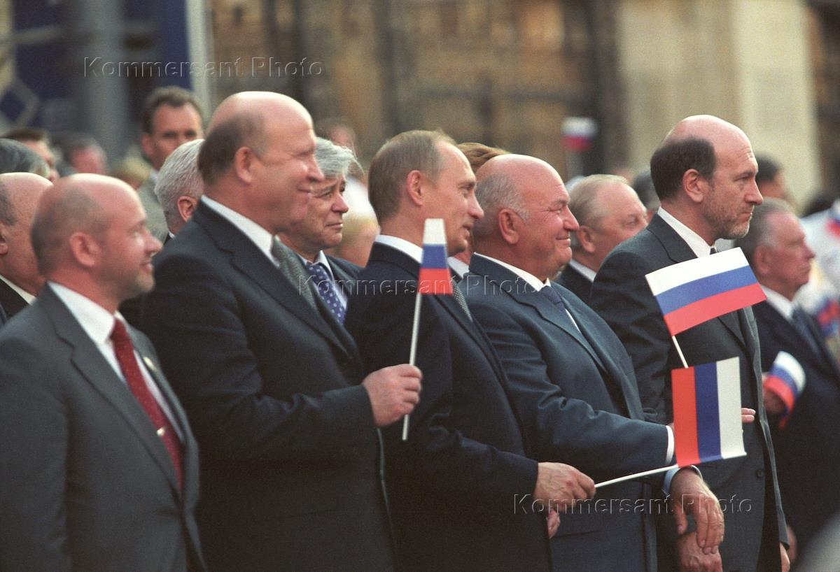 Слева направо: вице-мэр Москвы Валерий Шанцев, Президент России Владимир Путин, мэр Москвы Юрий Лужков на праздновании Дня принятия декларации о государственном суверенитете РФ. Праздничное шествие представителей 89 регионов России состоялись на улице Тверской.