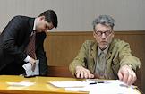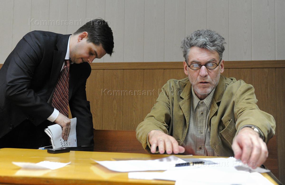 Музыкальный критик, искусствовед Артемий Троицкий (справа) и его адвокат Ярослав Кожеуров (слева) во время рассмотрения иска о защите чести и достоинства отставного майора ГИБДД Николая Хованского к Артемию Троицкому в Гагаринском районном суде.
