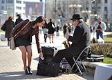 Жанровая фотография. Уличный музыкант играет на саксофоне на улице Минска.