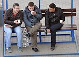 Жанровая фотография. Молодые люди сидят на скамейке на автобусной остановке и пьют чай из пластиковых стаканчиков.