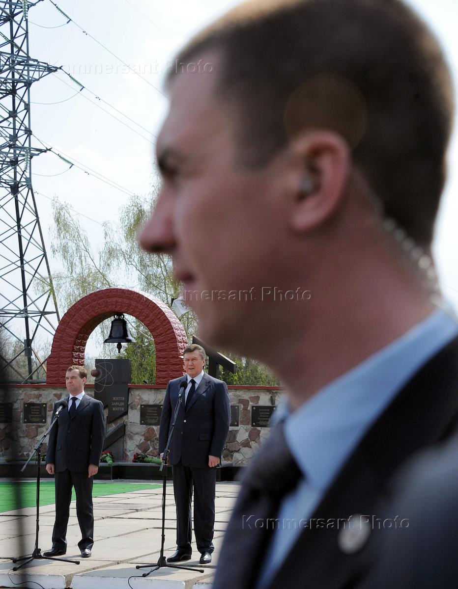 Мероприятия, посвященные 25-й годовщине трагедии на Чернобыльской АЭС. Президент России Дмитрий Медведев (слева) и президент Украины Виктор Янукович (справа) во время посещения мемориала в память о первых жертвах чернобыльской катастрофы, расположенный непосредственно на площадке перед зданием АЭС.