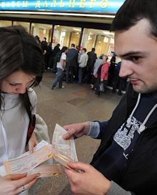 Жанровая фотография. Железнодоржные кассы на Ленинградском вокзале. Пассажиры проверяют купленные билеты.