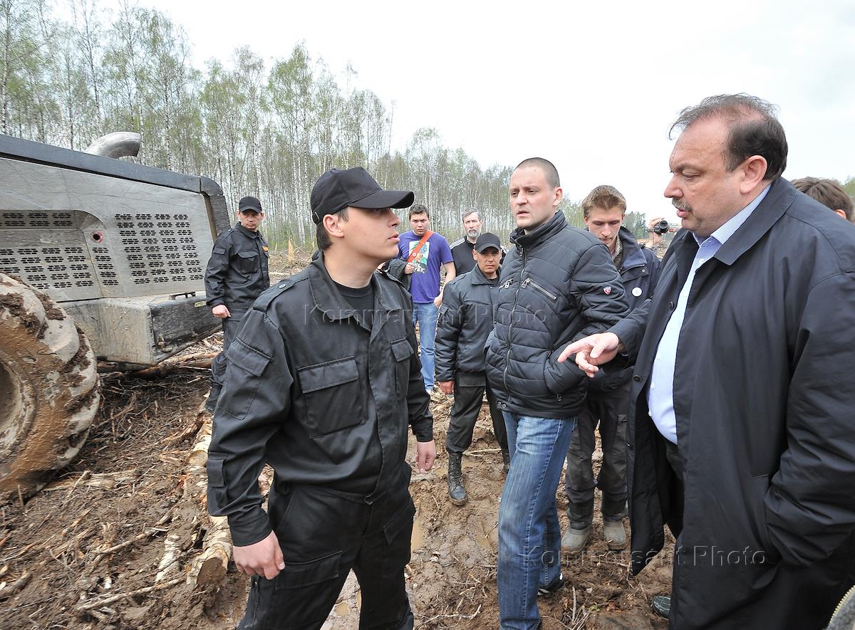 Лидер движения "Левый фронт" Сергей Удальцов (в центре) и член комиссии Государственной думы (ГД) России по законодательному обеспечению противодействия коррупции Геннадий Гудков (справа) во время акции против вырубки деревьев, организованной активистами движения по защите Химкинского леса.