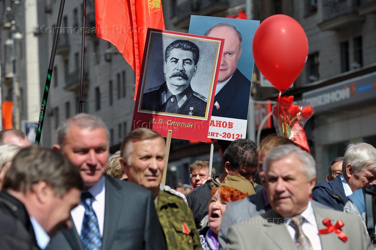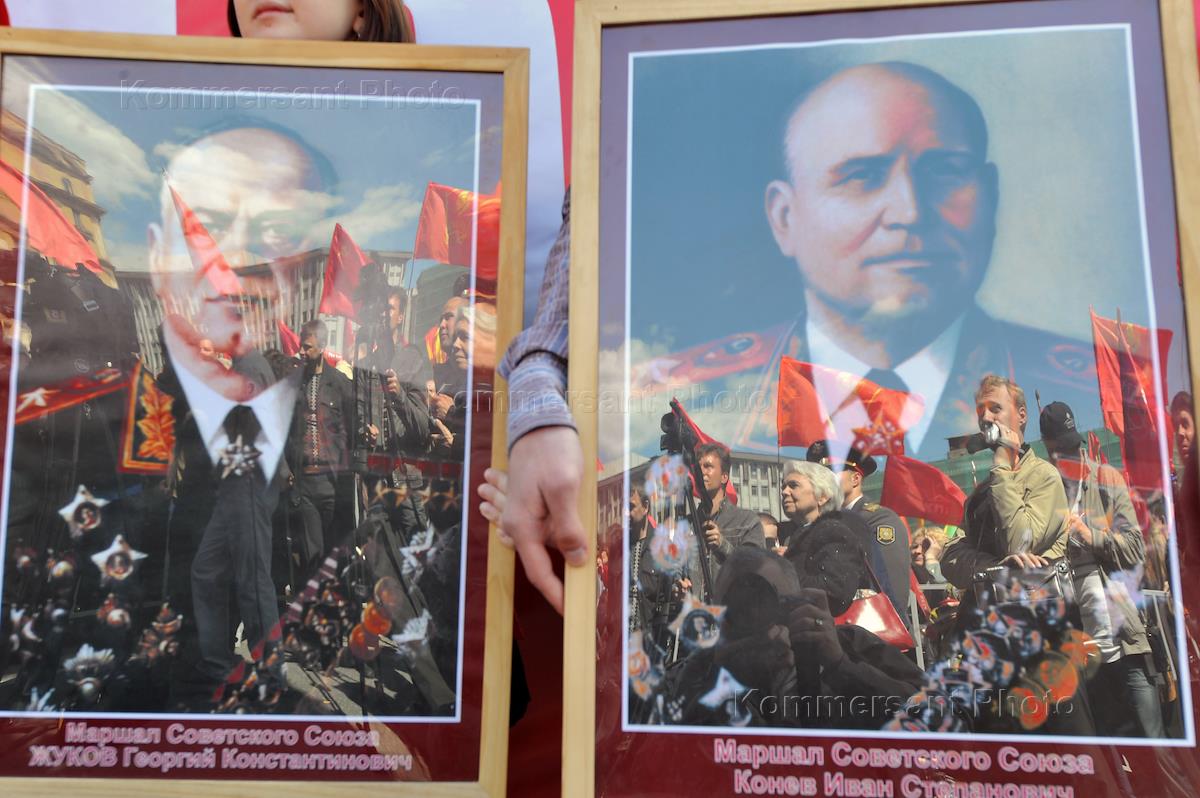 Шествие и митинг, посвященные 66-ой годовщине Победы в Великой Отечественной войне. Шествие и митинг, организованные активистами партии КПРФ и штабом протестных действий, прошли у станции метро "Пушкинская". Портреты маршалов Советского Союза Георгия Жукова и Ивана Конева.
