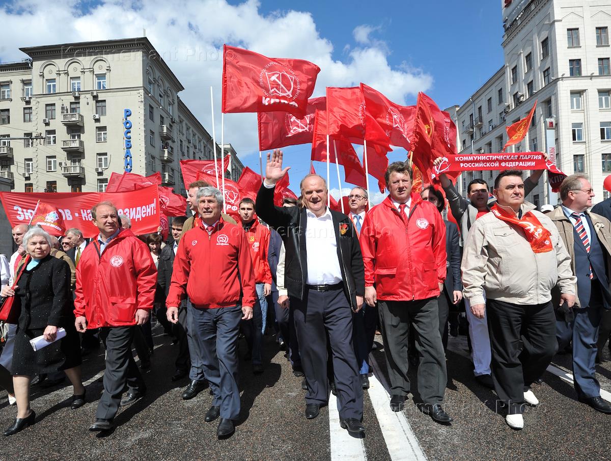 Лидер Коммунистической партии России (КПРФ) Геннадий Зюганов (в центре) во время проведения шествия и митинга, посвященных 66-ой годовщине Победы в Великой Отечественной войне. Шествие и митинг, организованные активистами партии КПРФ и штабом протестных действий, прошли у станции метро "Пушкинская".