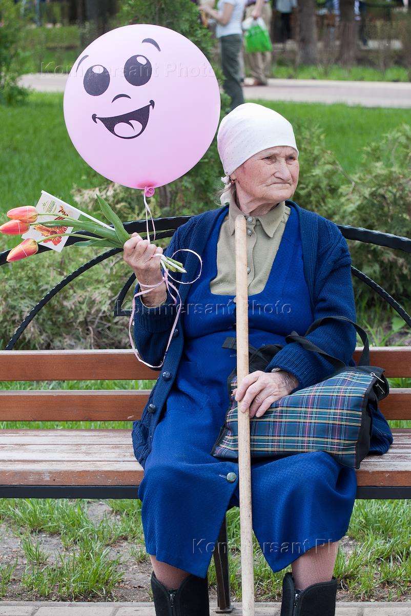 Празднование Дня Победы. Пожилая женщина отдыхает на лавочке в сквере.
