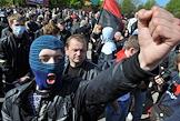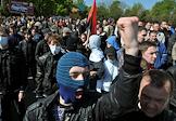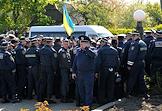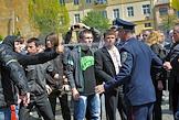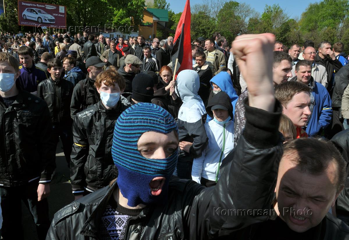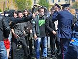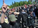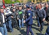 Столкновение сторонников националистической организации "Свобода" с представителями правоохранительных органов во время акции протеста против празднования Дня Победы у мемориального комплекса "Холм славы" во Львове.