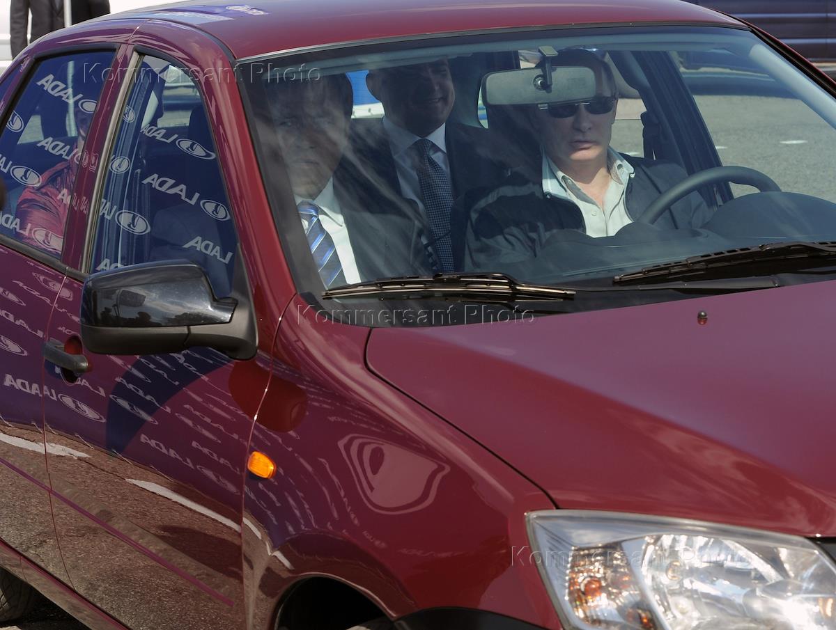 Директор "АвтоВАЗ" Игорь Комаров (слева) и председатель правительства России Владимир Путин (справа) за рулем автомобиля Lada Granta (Лада Гранта) во время осмотра автомобиля на экспериментальном треке на ОАО "АвтоВАЗ".