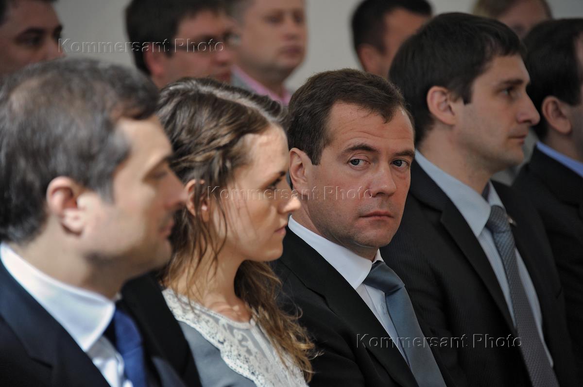 Первый заместитель руководителя администрации президента России Владислав Сурков (слева) и президент России Дмитрий Медведев (в центре) во время посещения комплекса автоматических систем для обработки бюллетеней в здании избирательной комиссии Костромской области.